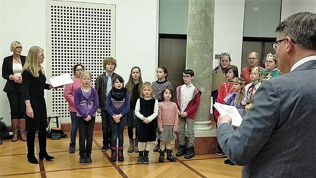 Der Hachenburger Kinderchor Vocalisti Piccoli hatte mit seiner Leiterin Veronika Zilles einen schönen und überzeugenden Auftritt beim Sternsingerempfang in Wiesbadens Staatskanzlei. Durch die Vermittlung des Pueri-Cantores-Verbandes des Bistums Limburg reisten die Kinder am 11. Januar schon am frühen Morgen gen Wiesbaden. Gemeinsam mit drei Sternsingergruppen aus dem Land Hessen gestalteten sie die Friedens- und Segensbotschaft, die sie Ministerpräsident Rhein, dem Staatsminister Wintermeyer sowie den Mitarbeitern der Staatskanzlei überbrachten.