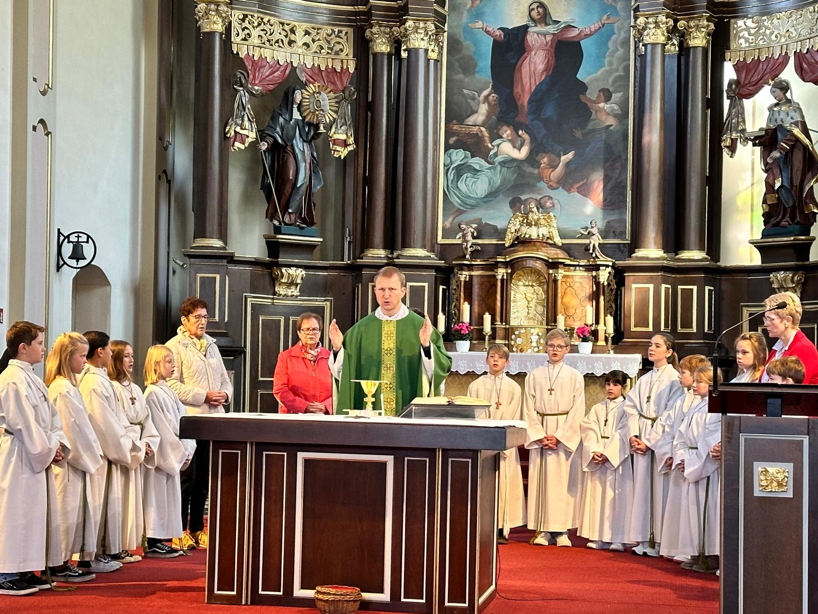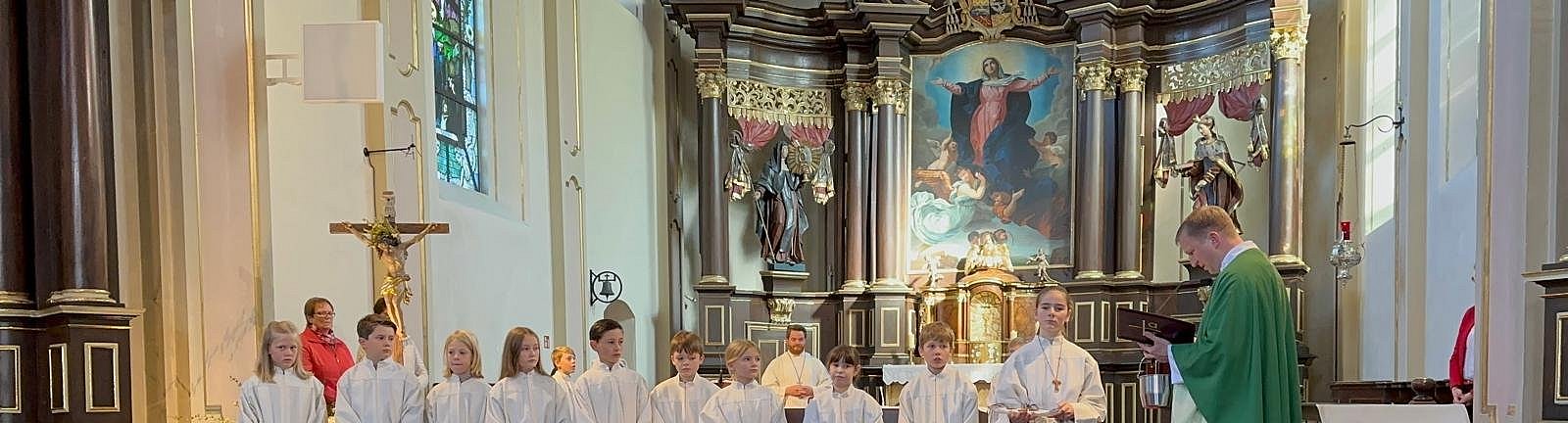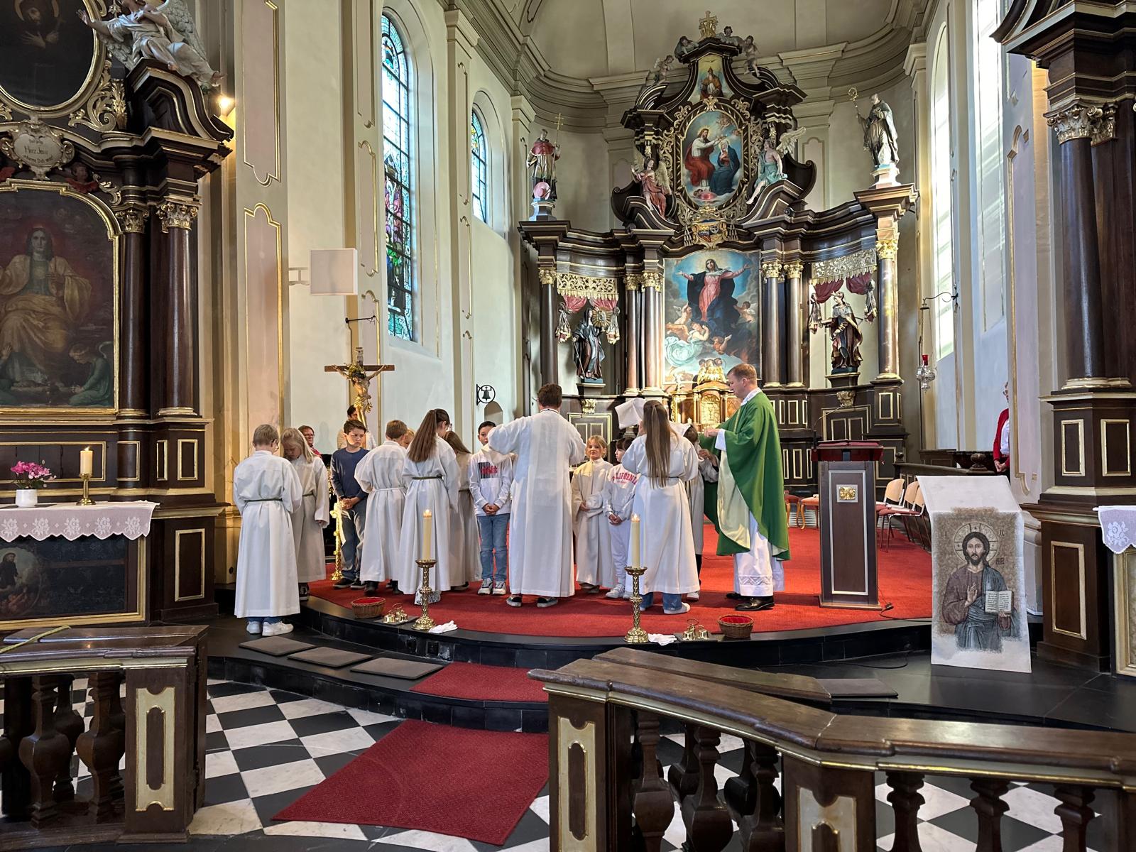 Ganz unerfahren sind die Kinder nicht mehr, da sie seit ihrer Erstkommunion im April bereits mehrfach in der Messe dienen durften. Auch bei den Feiertagen wie Fronleichnam, Maria Himmelfahrt oder bei der Priesterweihe von Pater Augustinus in Marienstatt waren bereits unsere Neu-Messdiener vertreten.