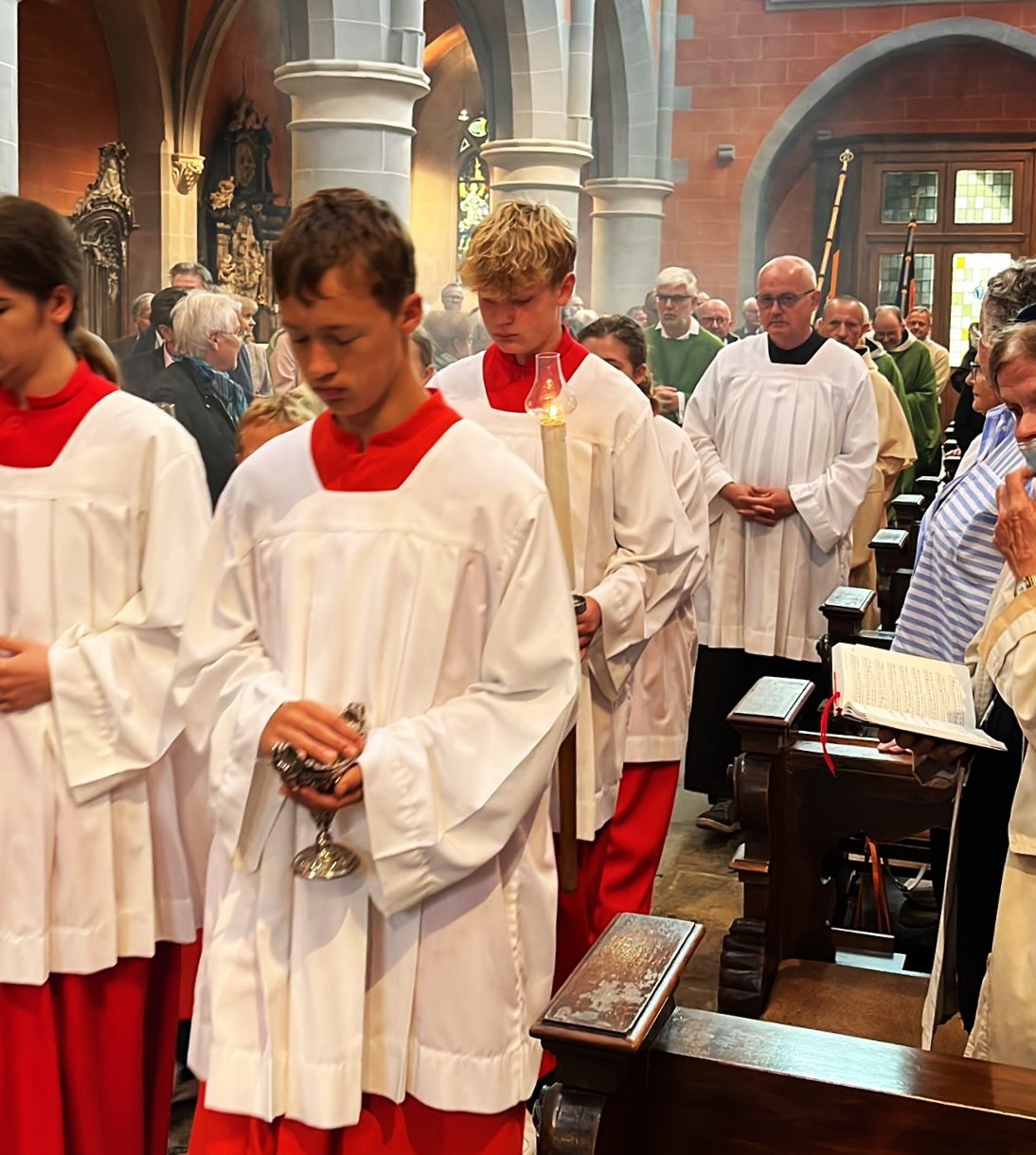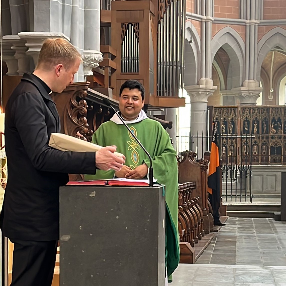 Nach der Priesterweihe durch Bischof Dr. Georg Bätzing am 23. Juni und der Klosterprimiz am darauffolgenden Tag feierte Pater Augustinus am 30. Juni seine Gemeindeprimiz in Marienstatt. Neben der Klostergemeinschaft gestalteten auch die Marienstatter Messdiener sowie der Kirchenchor Hachenburg/Marienstatt diesen festlichen Gottesdienst mit. An dessen Ende überreichte Pfarrer Wach dem Neupriester eine Stola als Geschenk der Pfarrgemeinde und lud alle zur anschließenden Primizfeier ins Pfarrheim ein. Dank zahlreicher helfender Hände aus der Pfarrei und darüber hinaus sowie dem Blasorchester Marienstatt konnten einige schöne Stunden miteinander verbracht werden. Pater Augustinus dankte allen herzlich, betonte, dass Marienstatt seine Heimat geworden sei, und bat um das Gebet der Gläubigen. Nach der Stärkung mit Kaltgetränken, Mittagessen sowie Kaffee und Kuchen spendete Pater Augustinus den Primizsegen im Anschluss an die tägliche Vesper der Mönche.