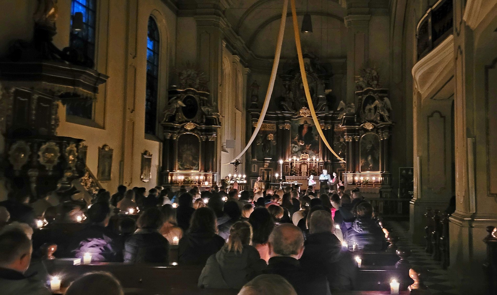 Nachdem man in die dunkle, fast volle Kirche eingezogen war, wurde nach und nach durch unzählige Kerzen die Kirche erhellt.