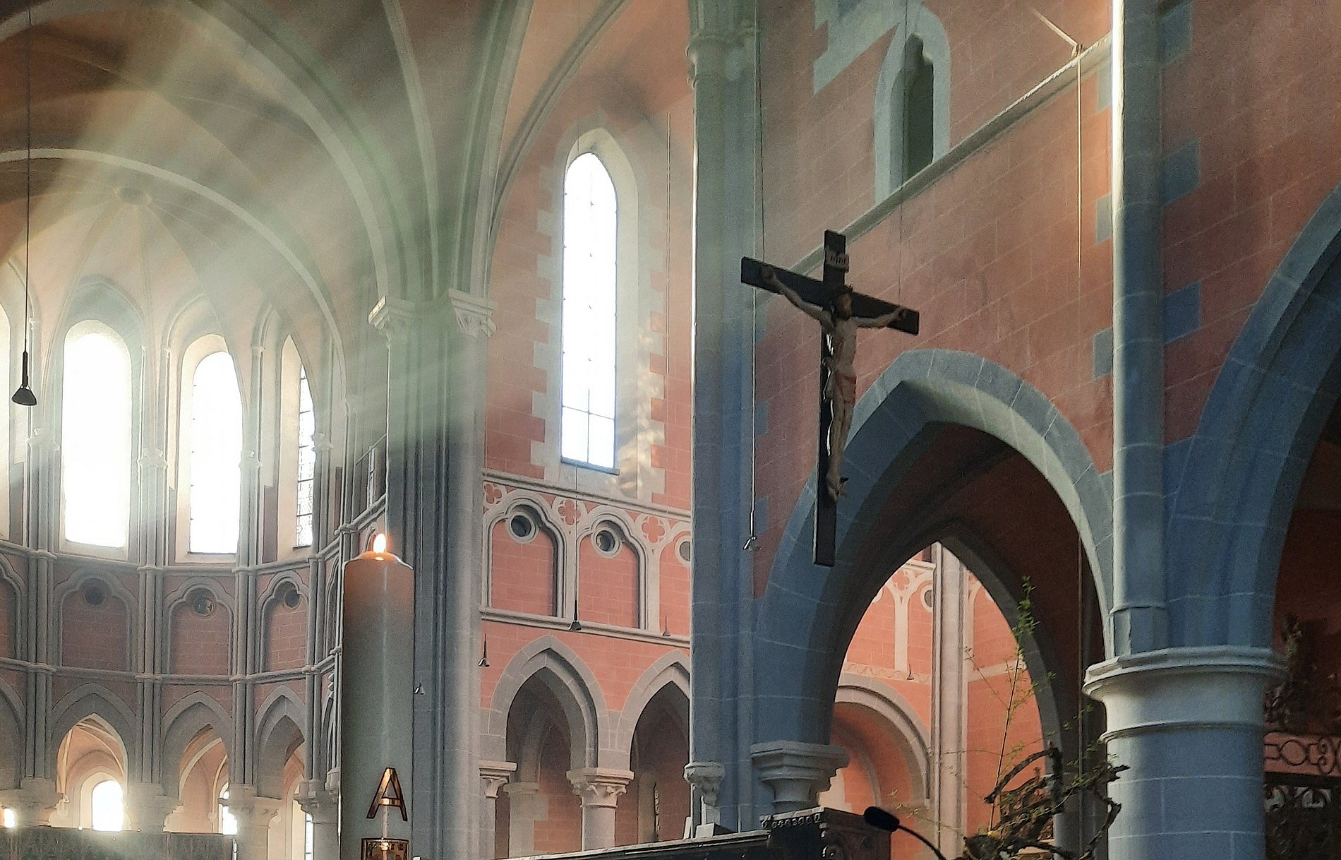 Langsam, aber beständig drang die Sonne am frühen Morgen des Ostersonntags in den Kirchenraum der Abteikirche und in den Kreuzgang des Klosters. Ein eindrucksvoller Moment. Das konnten die Mitfeiernden der Osternacht erleben, als sie sich auf den Weg von der Kirche zur österlichen Begegnung in den Kreuzgang machten, wo Pater Martin, Mitarbeiterinnen der Klosterküche und Mitglieder des Ortsausschusses warme Getränke und Osterzöpfe bereitgestellt hatten. Das Angebot wurde rege angenommen.