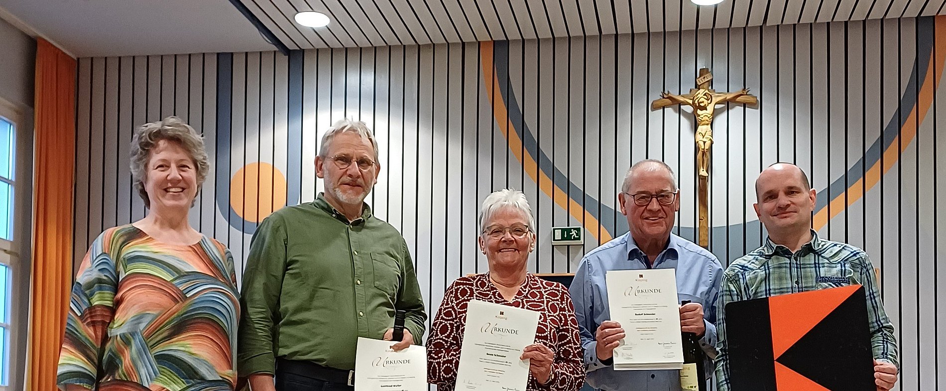Anette Kempf  (Leitungsteam), Gottfried Weller, Mörlen (40 Jahre Zugehörigkeit), Beate und Rudolf Schneider( je 25 Jahre Zugehörigkeit), Rainer Hardieß (Leitungsteam)