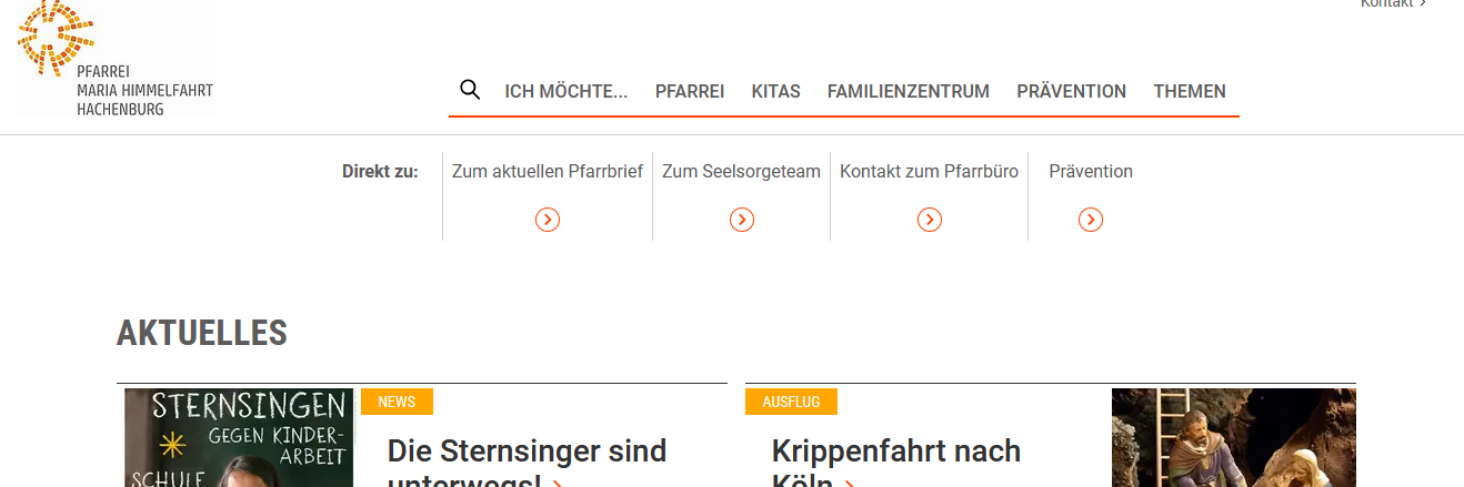 Dass es nun wieder ein richtiges Seitenmenu gibt, haben wir auch genutzt: So bietet nun der Menu-Punkt "Ich möchte..." einen bequemen Weg zu vielen Anfragen, mit denen das Pfarrbüro häufig konfrontiert wird. Unter "Pfarrei" findet sich ein Überblick über das Seelsorge- und Verwaltungspersonal, die Gremien, Einrichtungn und die Gruppen der Pfarrei. Extra aufgenommen in das Menu haben wir das Familienzentrum und unsere beiden Kitas, die jeweils vollwertige Unterseiten besitzen, auf denen sie ihre Inhalte präsentieren.
